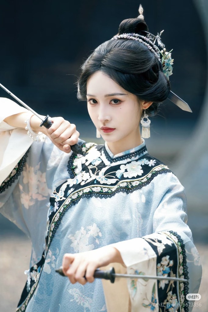 Dans la Chine impériale, les femmes n’avaient généralement pas le droit de porter des armes visibles en public. Pourtant, dans les familles pratiquant les arts martiaux, dans les milieux militaires ou dans les sociétés secrètes, certaines femmes étaient formées au combat, à l’autodéfense ou à des missions de transport ou d’espionnage.